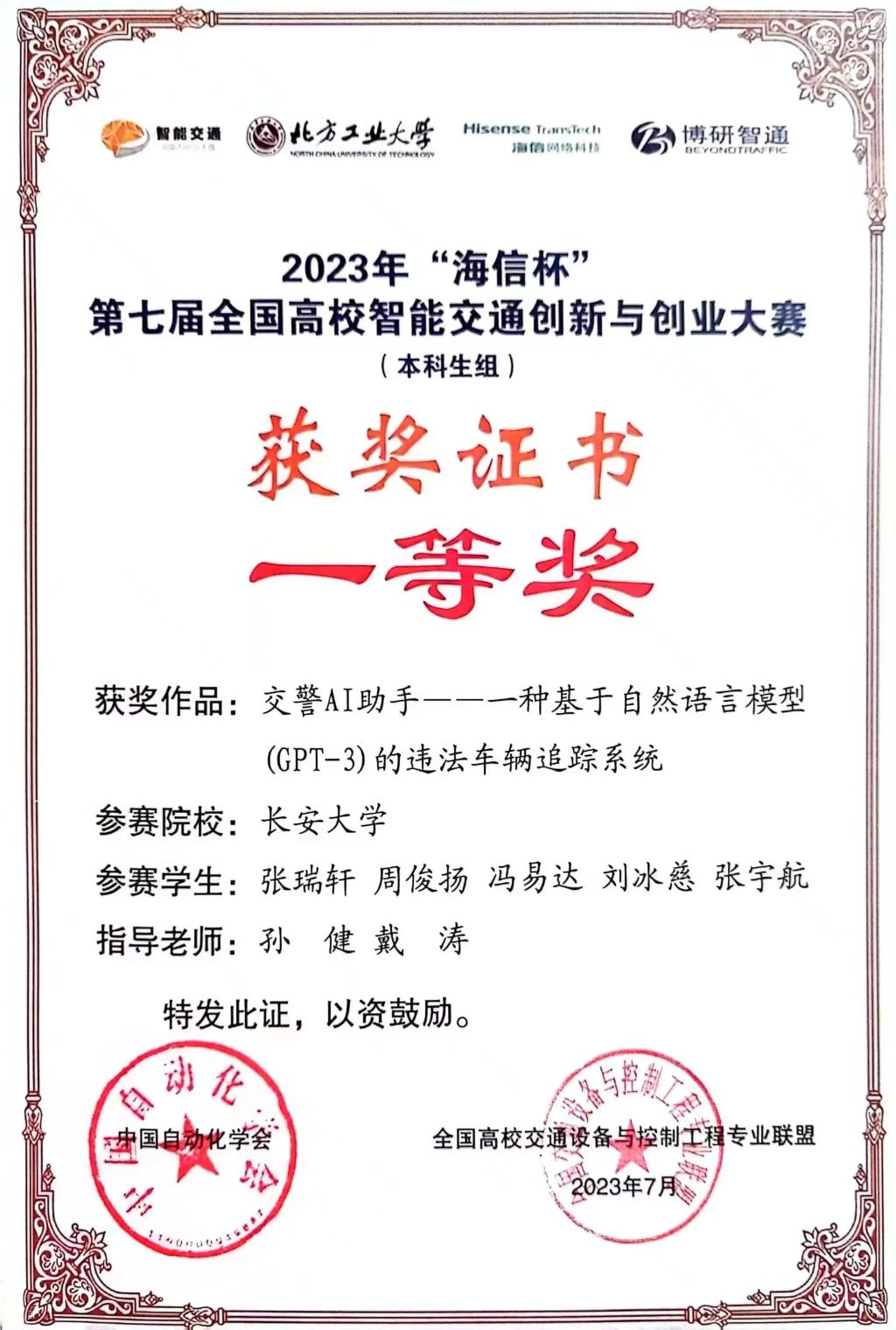 近日,2023年“海信杯”第七届全国高校智能交通创新与创业大赛决赛在北方工业大学举办。在孙健和戴涛两位老师的指导下,独播库 2021级本科生“未来交警AI队”(组长:张瑞轩,成员:周俊扬、冯易达、刘冰慈、张宇航)作品《交警AI助手——一种基于自然语言模型(GPT-3)的违法车辆追踪系统》,在全国总决赛中荣获一等奖。