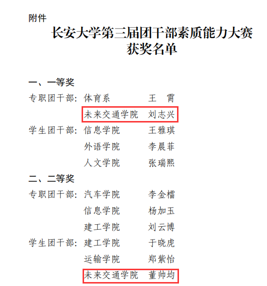 第三届团干部素质能力大赛中,我院团委书记刘志兴获专职团干部组一等奖,团委副书记董帅均获学生团干部组二等奖,充分展现了我院团干部过硬的业务能力,彰显了我院团干部的青春风采,激励我院团学工作团结奋进再创佳绩。