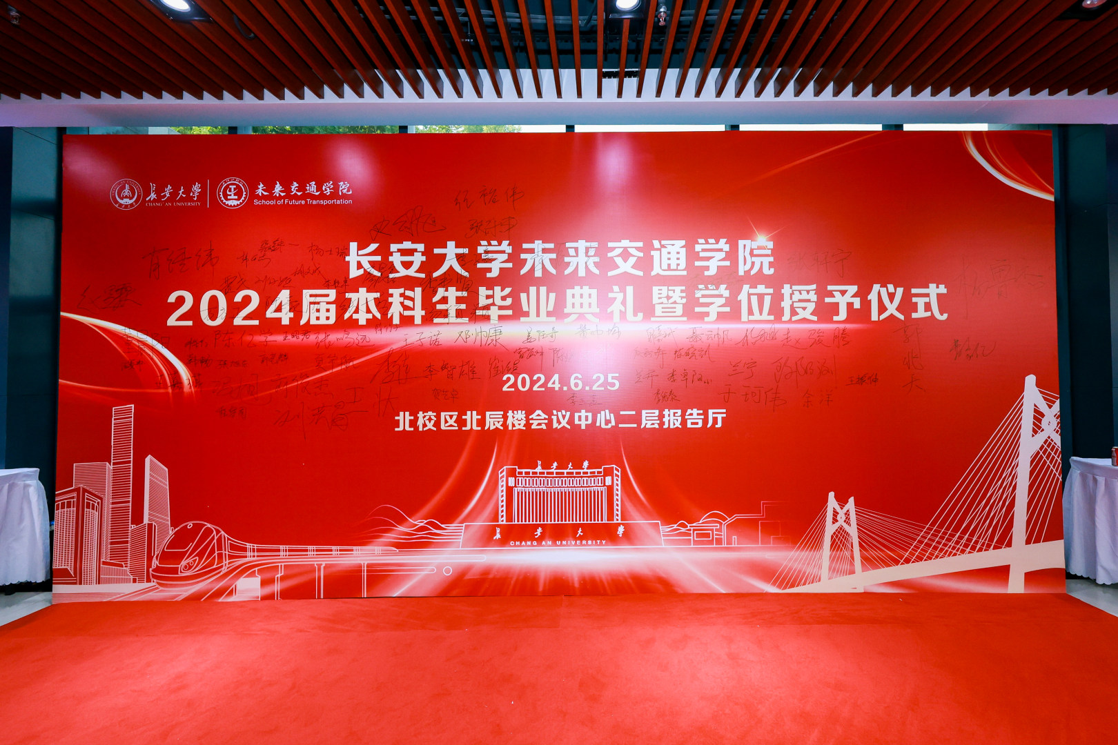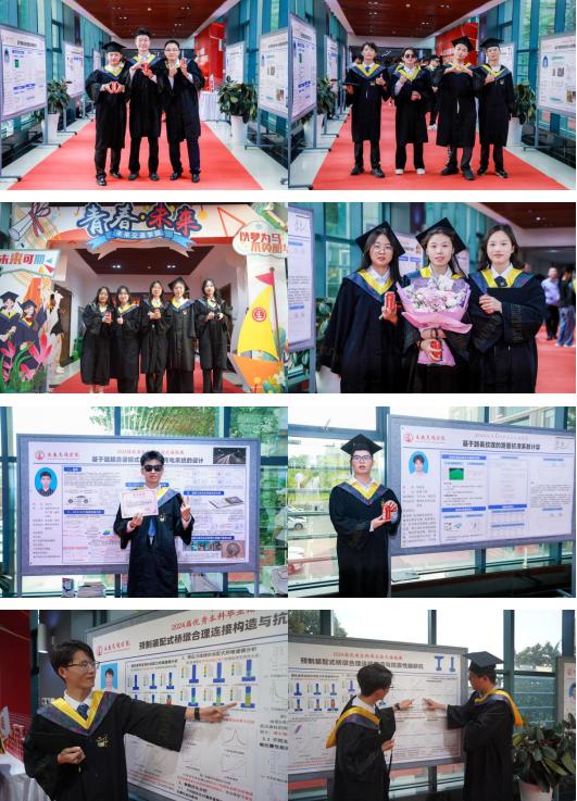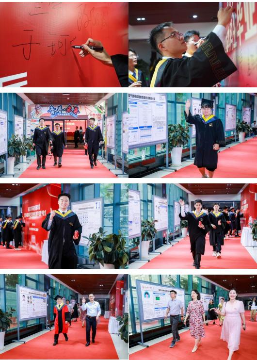 星光洒落大道,映照青春脚步。典礼前,学院为首届毕业生们铺设“星光大道”红毯走秀,以摄影形式定格青春瞬间。毕业生们在签名墙上签下自己的名字,记录四年青春记忆。连廊两旁,陈列学院优秀毕业论文海报,彰显科研风采,寄语未来梦想。