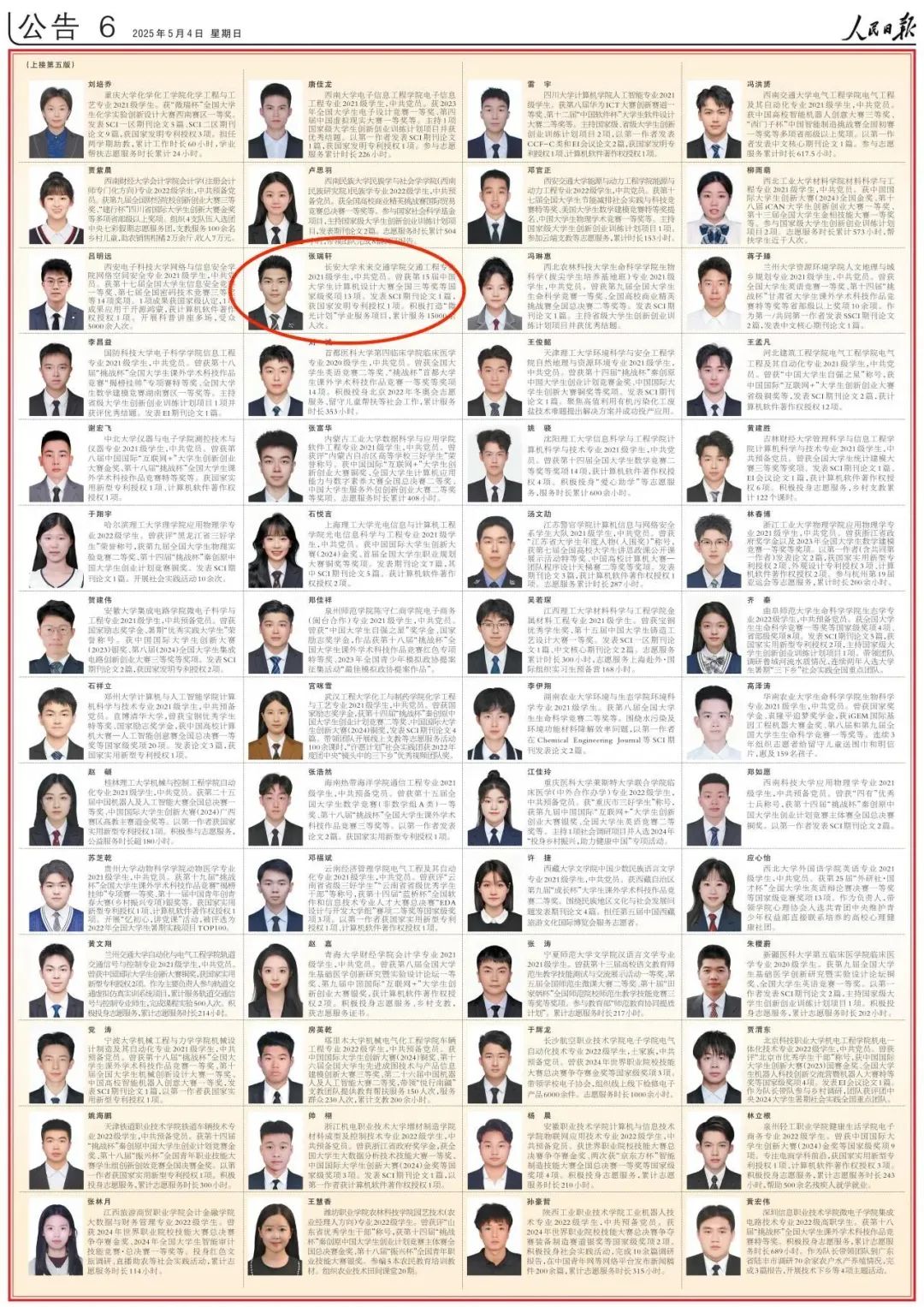 5月4日,《人民日报》从全国12万名2023—2024学年度本专科生国家奖学金获得者中遴选了100名优秀学生代表,刊登了《2023—2024学年度本专科生国家奖学金获奖学生代表名录》,我院2021级本科生张瑞轩,榜上有名。