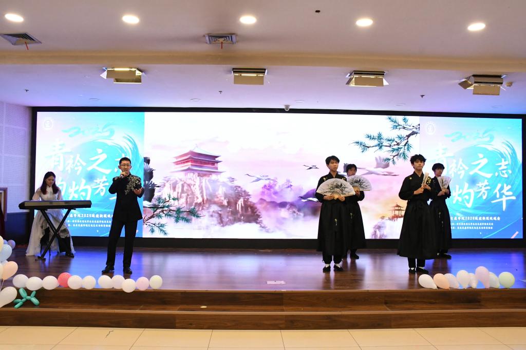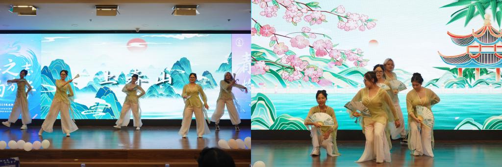 《上春山》以极具东方韵味的扇舞与柔美身段,勾勒出一幅诗意盎然的春日画卷。中外学子的默契配合,不仅展现了中华传统文化的魅力,更体现了学院国际化氛围下的文化交融。