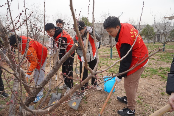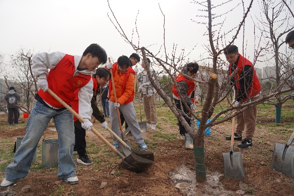活动现场,支部党员们热情高涨,分组植树、分工协作。挥锹铲土、扶苗填坑、围堰浇水,每道工序都严格遵循“三埋两踩一提苗”的标准化流程。在春日暖阳下,数余株新栽的幼苗错落有致,挺拔的枝干与舒展的新叶相映成趣,为校园增添了盎然生机。