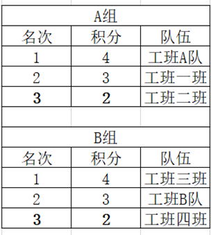 经过各球队四天的激烈比拼,“迎新杯”小组赛落下帷幕,共有四支球队晋级半决赛:工科一班,工科三班,工班A队,工班B队。