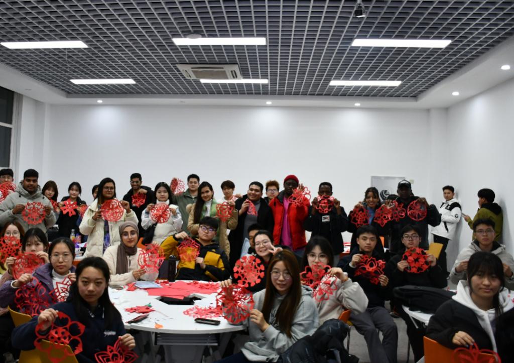 实践环节中,“创意Paper Cut”将气氛推向高潮。中外学生分组合作,手持红纸与剪刀,剪出各式各样的剪纸及花鸟图案。随后的“Free Talk”环节,志愿者用英语解释“文化交融”的理念,赢得连连赞叹。同学们也以剪纸作品为切入点,用英语分享家乡故事。这些故事不仅展现了中华文化的独特魅力,也让同学们在分享中锻炼了英语口语表达,增强了文化自信。