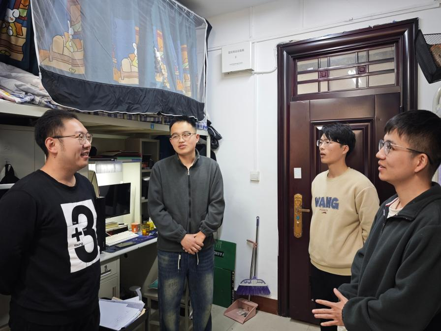 学生住宿须知》,开展宿舍安全卫生教育,并组织学生对宿舍进行全面清洁。之后,刘志兴走访南北校区学生宿舍,与学生面对面交流,送去温暖和关怀。他询问同学们的科研进展、生活需求和心理健康状况,针对学业压力、职业规划等共性问题给予建议,并重点检查了宿舍用电安全与卫生环境,排查宿舍安全隐患,强调了宿舍作为集体生活场所,宿舍成员应保障宿舍良好的卫生环境,保持自身健康的生活习惯。