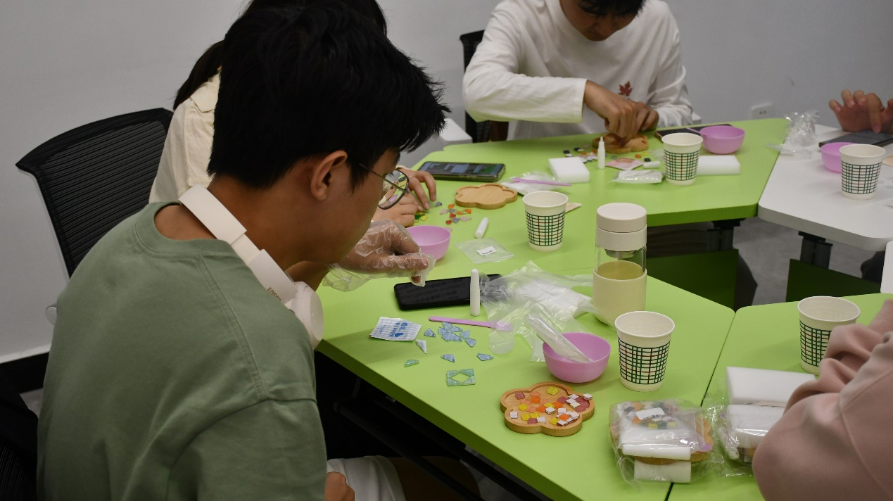在理论讲解之后,同学们开始了期待已久的马赛克杯垫制作环节。活动准备了丰富的材料包,包括各种颜色的瓷片、玻璃粒、白乳胶、填缝剂等。在工作人员的指导下,同学们纷纷动手创作,先用胶水在杯垫上勾勒出设计图案,再将五彩斑斓的马赛克碎片仔细粘贴,最后用填缝剂和海绵擦拭完成收尾工作。经过一个多小时的精心制作,一个个独一无二的“心灵之窗”逐渐成形,充分展现了同学们丰富的想象力和创造力。