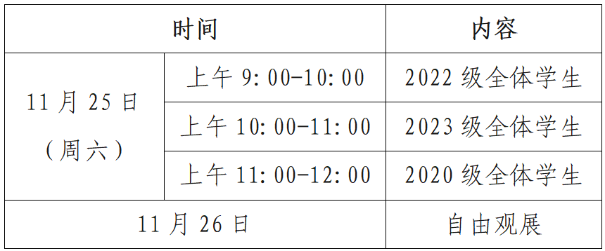 学院统一制作海报展出,11月25日(本周六)上午将进行海报集中评审,2021级全体同学到场进行现场解说,专业评审分组进行打分,其他年级同学作为大众评审现场打分,本次海报展分批分时段参展,具体日程安排如下:
