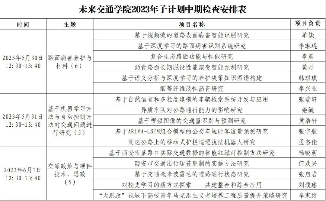 活动时间:5月30日至6月1日12:30-13:40                                                  本次中期检查,根据各队伍题目不同,计划在三天时间内进行交流汇报,每场答辩将围绕同一题目类型开展,学院将邀请专业教师对项目逐一点评。中期检查各队伍顺序安排如下,同时欢迎感兴趣的同学前来学习交流。
