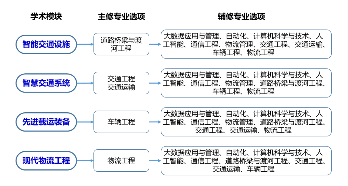 独播库 本科生按照工科试验班大类招生,并根据独播库 优势专业和交通运输工程学科未来发展趋势设置四大学术模块,包括智能交通设施、智慧交通系统、先进载运装备、现代物流工程。每一学术模块下,设置一到两个主修专业和多个可选辅修专业。专业分流时学生可根据兴趣和志愿选择一个主修专业和一个辅修专业,毕业证书和学位证书上同时标注主修专业和辅修专业。